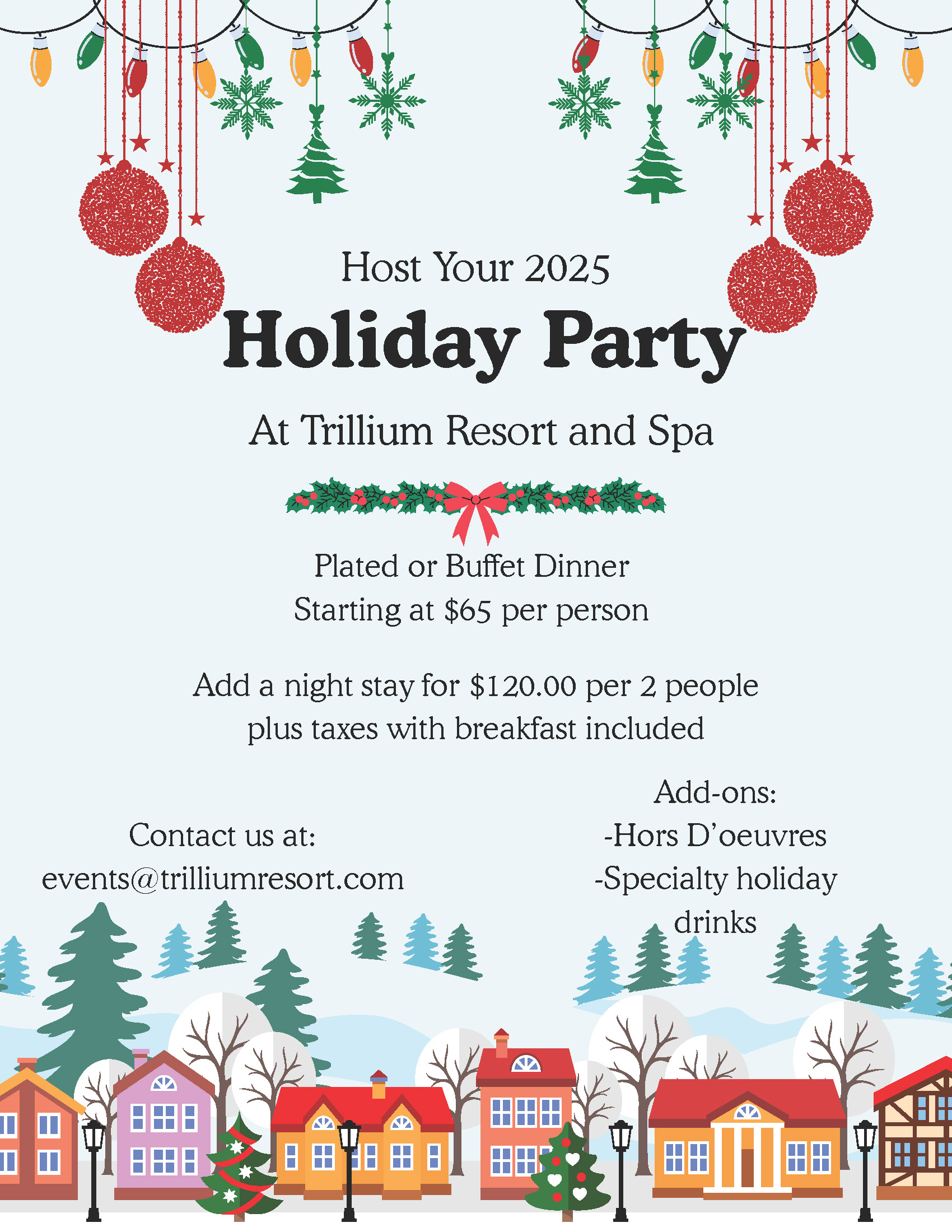 Looking for an ideal Christmas party venue? Trillium Resort & Spa offers a unique holiday dining experience with exclusive use of their Post & Beam Dining Room for luncheons and dinners for groups of 30 to 130. Trillium Resort offers a select Christmas menu with buffet or plated options starting at $65 per person, genuine Muskoka-style onsite accommodations, and great accommodation rates discounted especially for Christmas parties. Ask about local DJ’s and live music options for a truly festive holiday party! Contact events@trilliumresort.com. Learn more