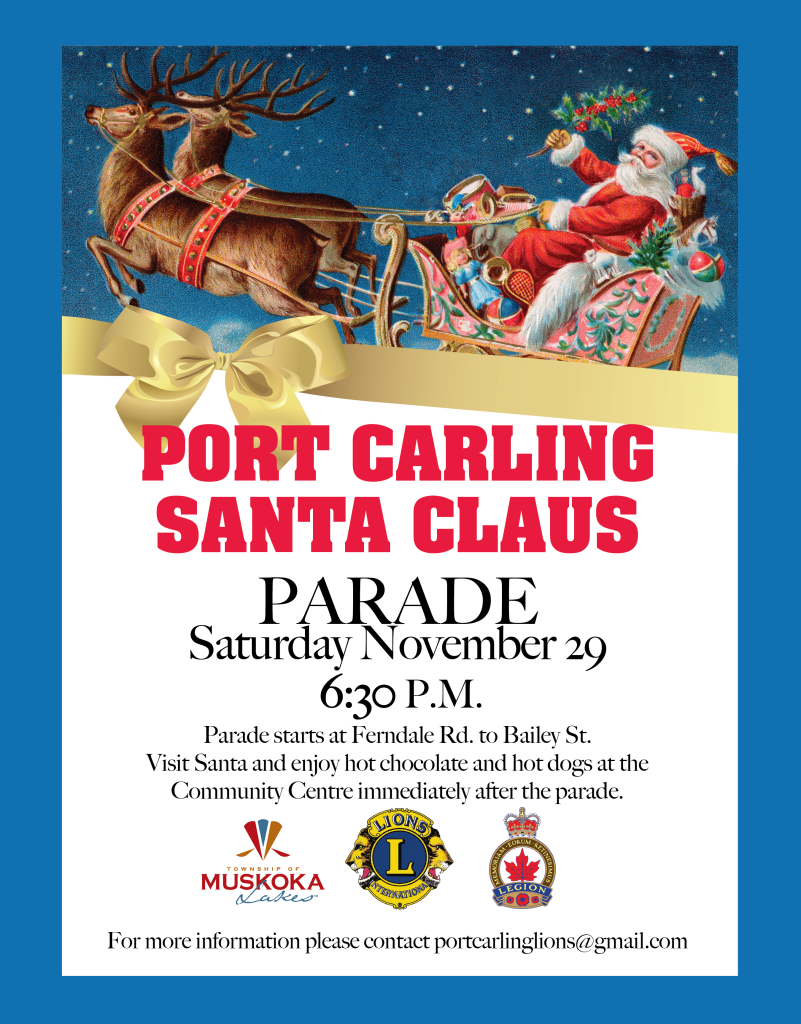 The Port Carling Lions Club Santa Claus parade will be held November 29, 2025 starting at 6:30pm.