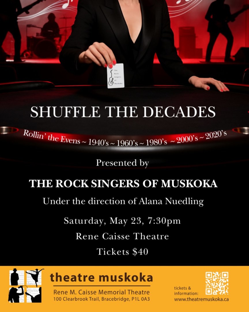 THE ROCK SINGERS OF MUSKOKA presents SHUFFLE THE DECADES: Rock Hits Across Eras, under the direction of Alana Nuedling. Last Season we ‘Rocked the Odds’, now we’re ‘Rollin the Evens’ with Hits from the 1940s, 1960s, 1980s, 2000s, and 2020s. This engaging show takes you on a fun journey through rock ‘n’ roll history with 75 voices backed by a live band. It spotlights timeless hits from even decades, evoking the feel of each era with great harmonies that get the crowd singing along. Under Alana Nuedling’s direction, The Rock Singers of Muskoka deliver their signature style and passion for music across the years.
